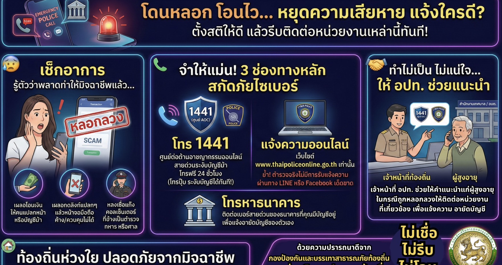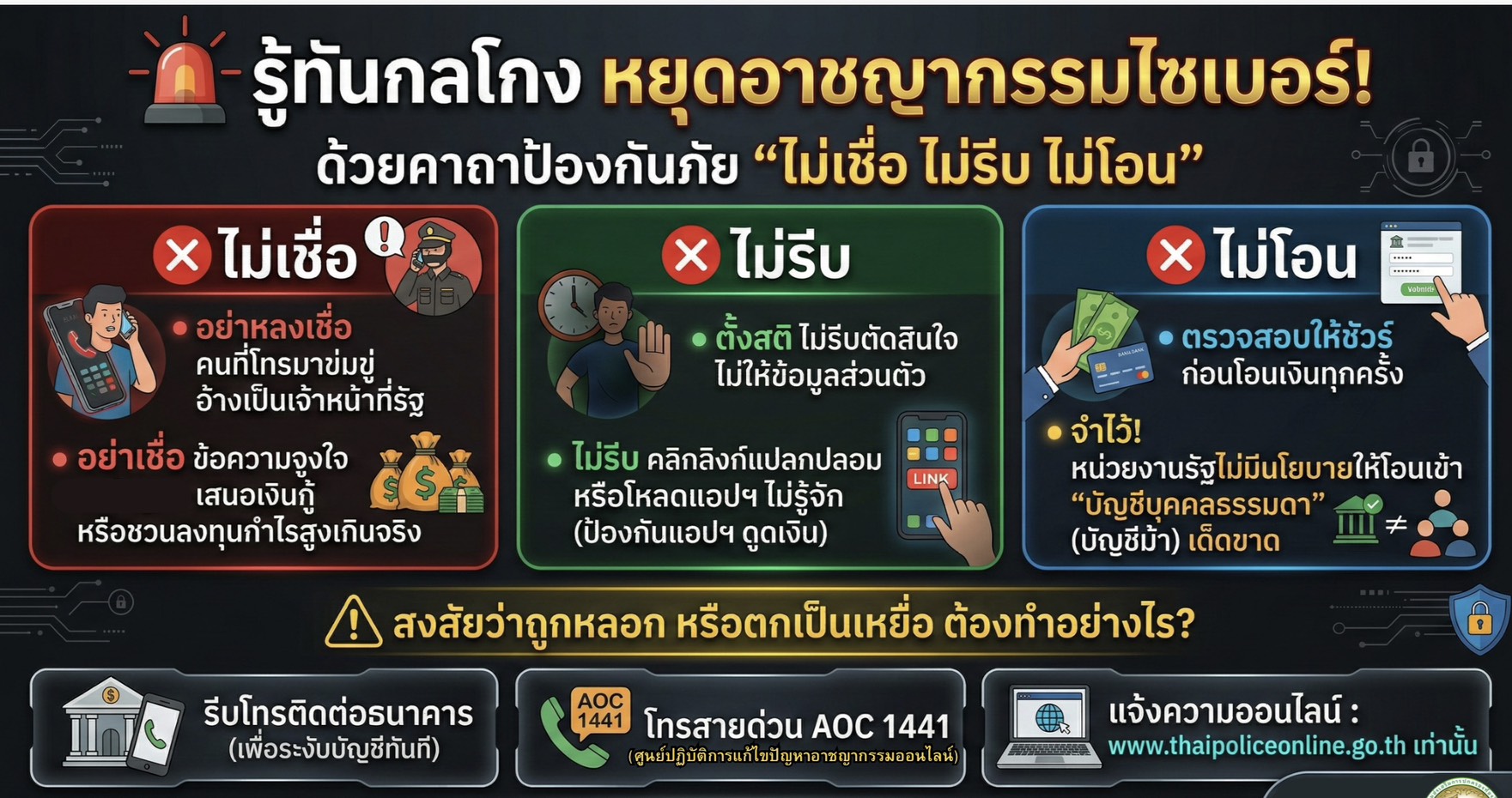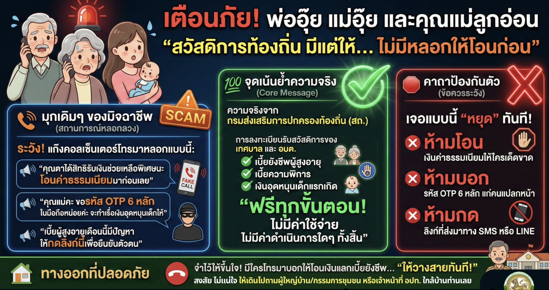 การสร้างความรู้ความเข้าใจเพื่อป้องกันการหลอกลวง ทางออนไลน์ (Scammer) เป็นการขับเคลื่อนนโยบายรัฐบาลและกระทรวงมหาดไทย การสร้างการรับรู้ให้แก่ประชาชนในการป้องกันปัญหาอาชญากรรมทางไซเบอร์ การพนัน และการหลอกลวงในรูปแบบต่าง ๆ กรมส่งเสริมการปกครองท้องถิ่นได้จัดทำอินโฟกราฟฟิก เพื่อเผยแพร่ความรู้ความเข้าใจเกี่ยวกับรูปแบบมิจฉาชีพพที่พบบ่อยตามแต่ละช่วงวัยและแนวทางป้องกัน "ไม่เชื่อ-ไม่รีบ-ไม่โอน" เพื่อสร้างการรับรู้สร้างภูมิคุ้มกันทางความคิด และความรู้เท่าทันให้แก่ประชาชน